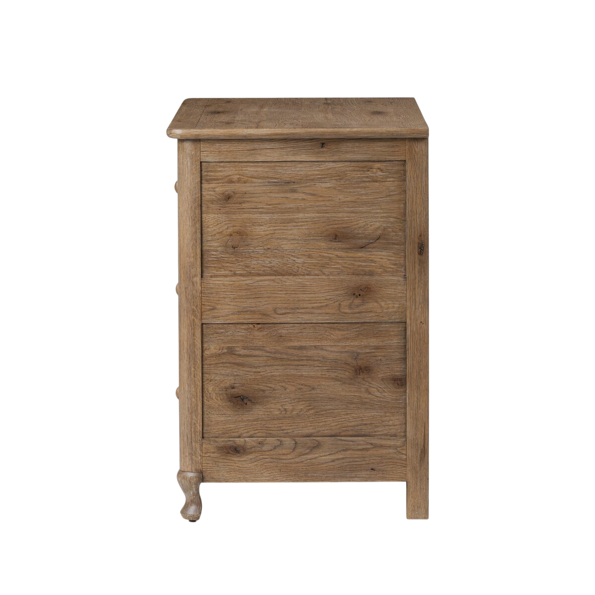 La façade se distingue par de délicates moulures perlées encadrant les tiroirs, un détail raffiné qui rappelle l’esthétique des meubles d’héritage. Sa finition brun tonal, profonde et chaleureuse, est subtilement complétée par des poignées en bois tourné, renforçant son caractère authentique et durable.