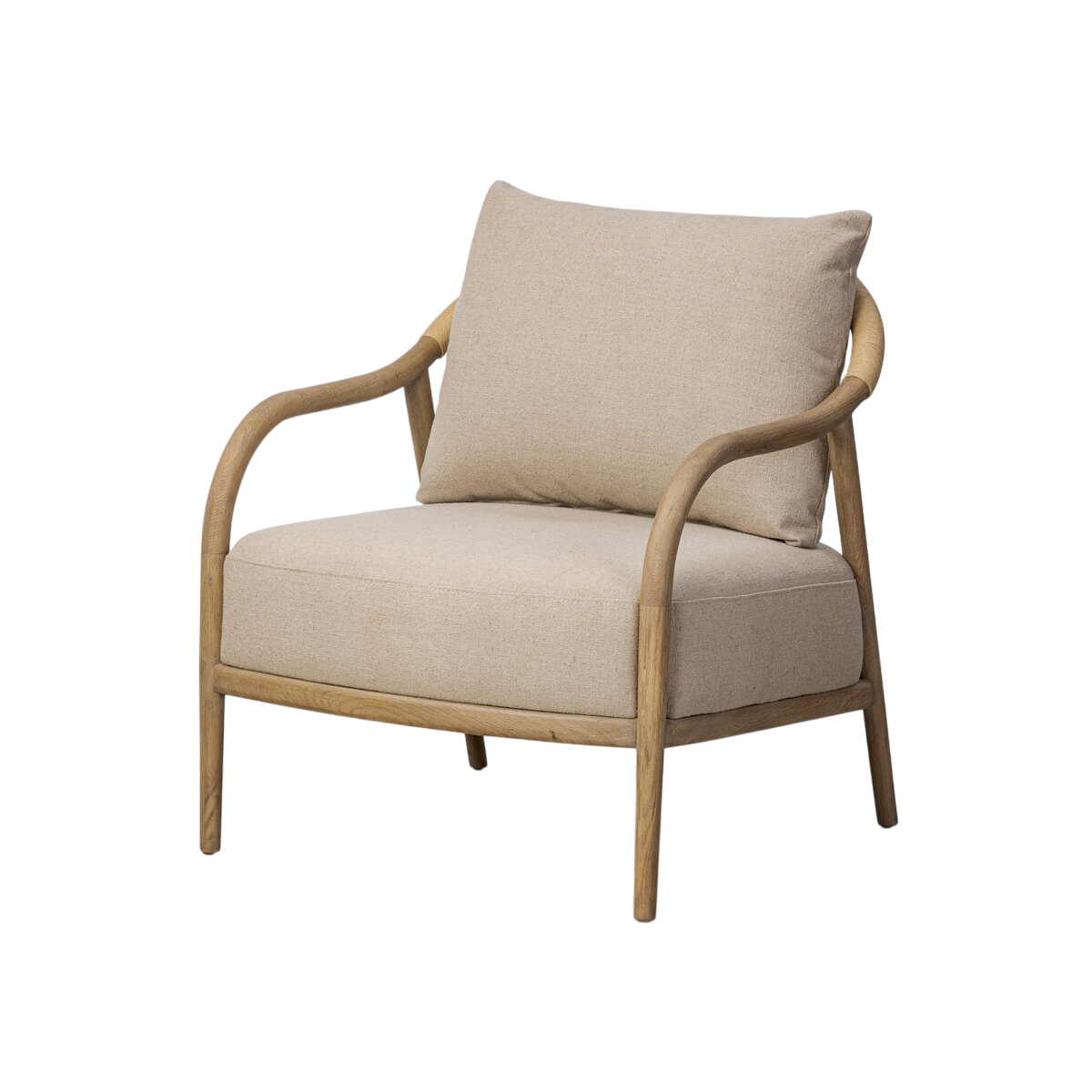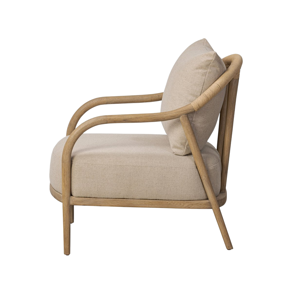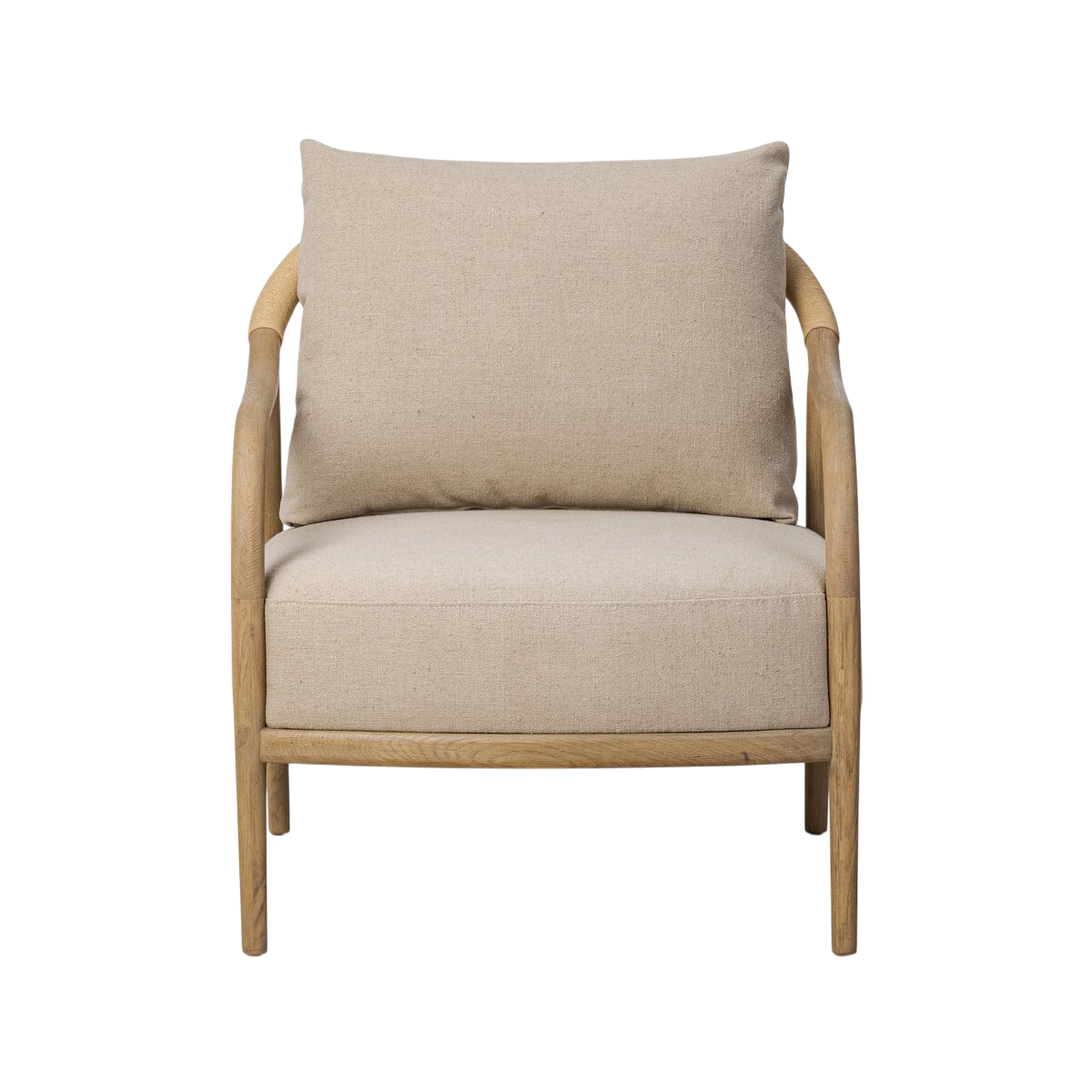 Le savoir-faire se révèle dans ses lignes fluides qui se prolongent jusqu’à des pieds tournés robustes, assurant une base solide et équilibrée. L’assise fixe, soutenue par des ressorts en S, offre un confort durable, complété par un coussin libre recouvert d’un tissu taupe au fini toile de jute, à la fois sobre et raffiné.