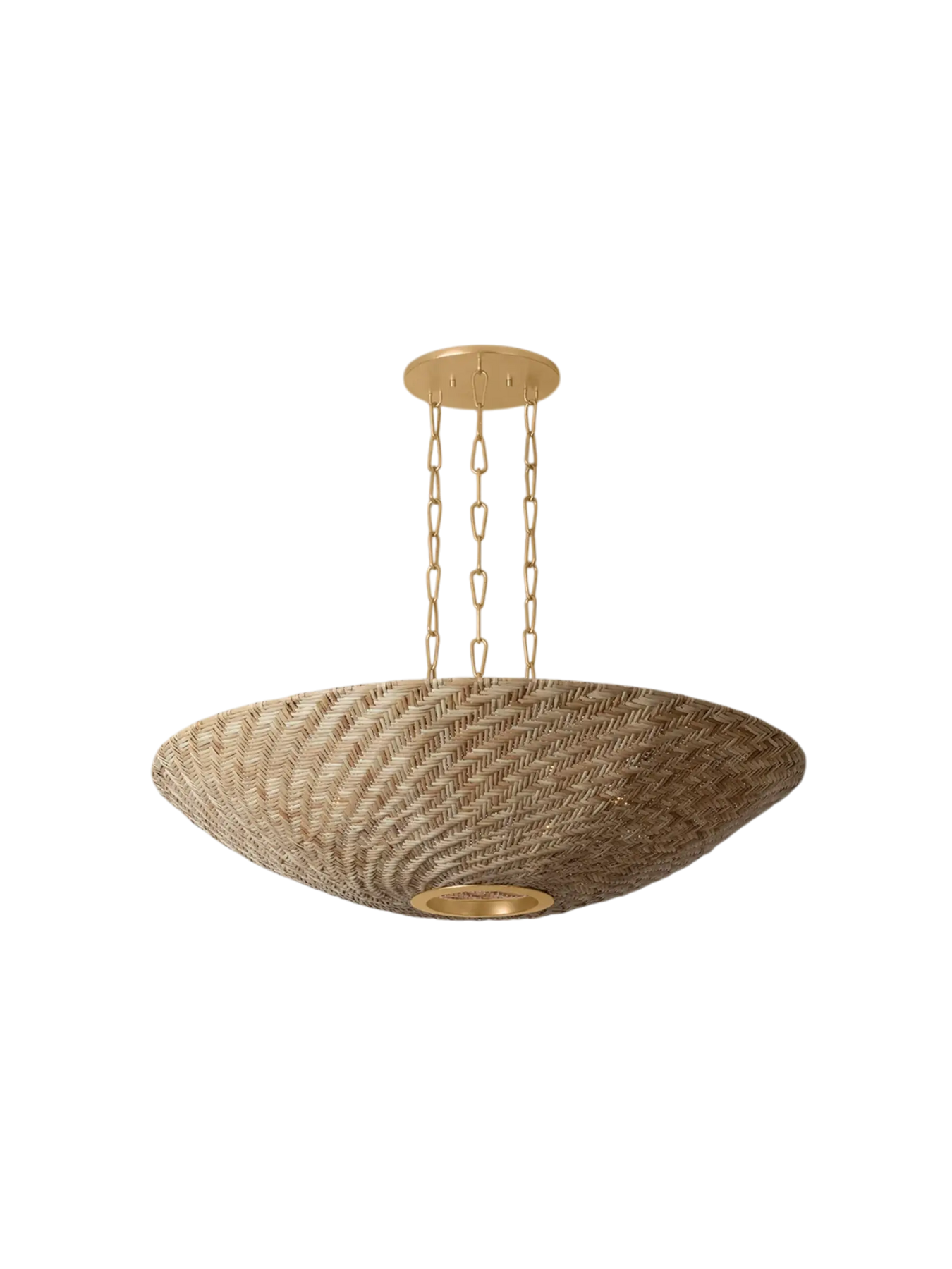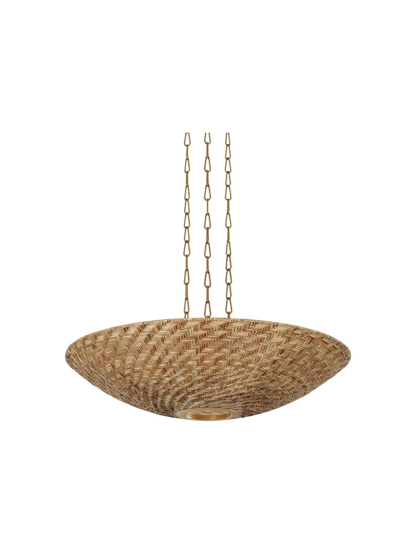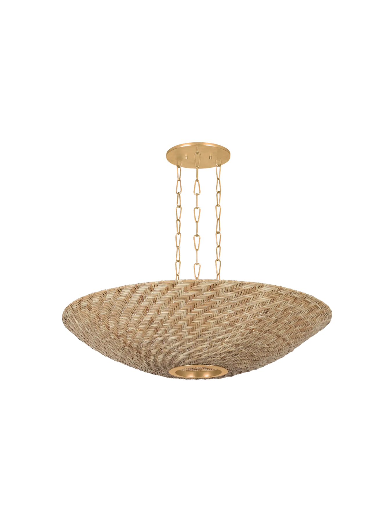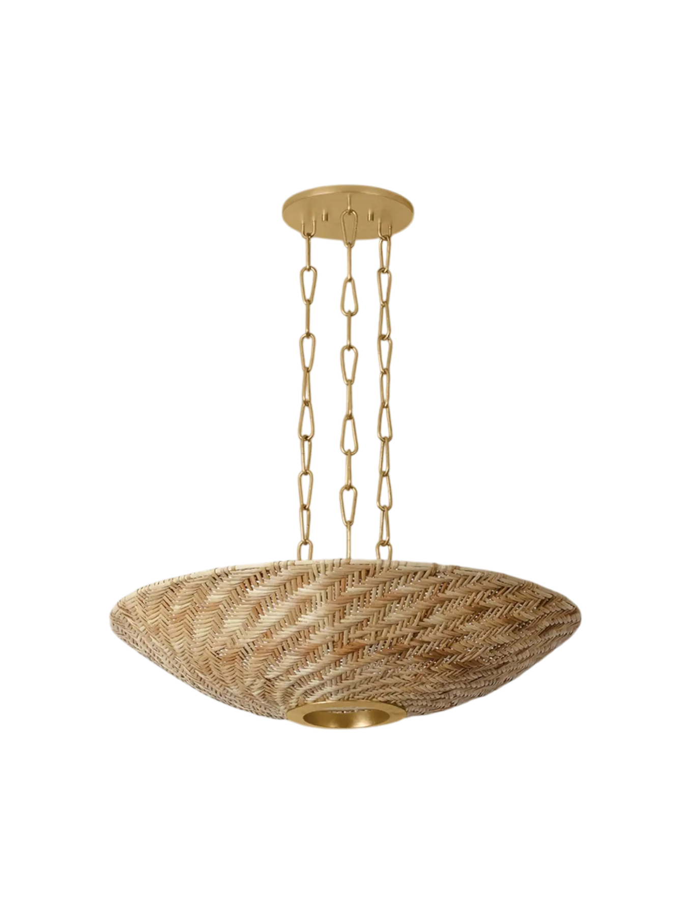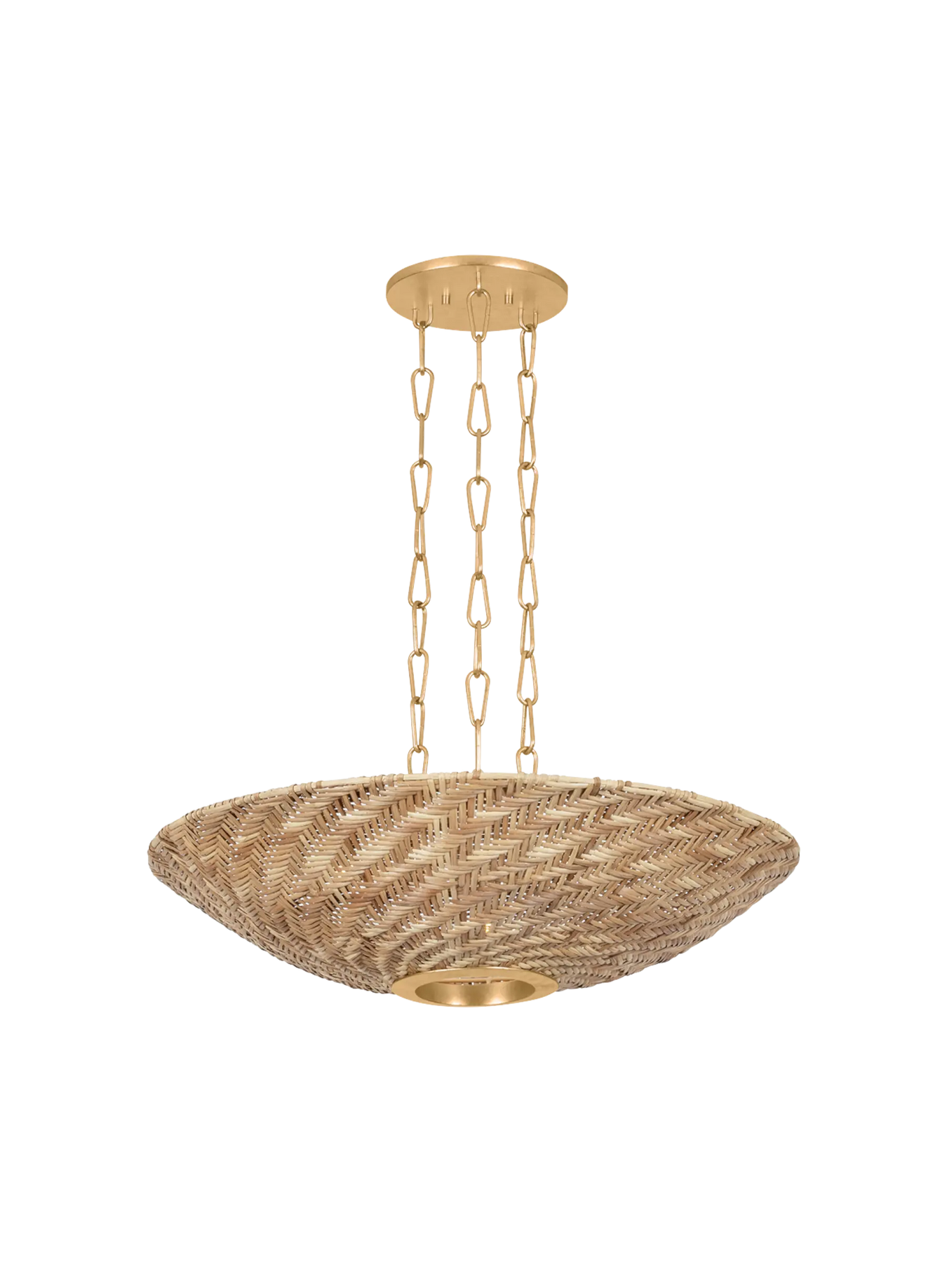La collection Ollie associe le rotin naturel et texturé à une quincaillerie au fini or vieilli (Vintage Gold Leaf) pour créer un style à la fois élégant et décontracté. L’osier clair naturel court en diagonale sur la surface de l’abat-jour, révélant un effet moiré dynamique. Inspirée de designs vintage, la suspension aérienne est composée de trois longues chaînes de maillons et d’un large baldaquin assorti aux dimensions de l’abat-jour. Disponible en version suspension à 3 lumières ou lustre à 6 lumières avec un fini or vieilli.