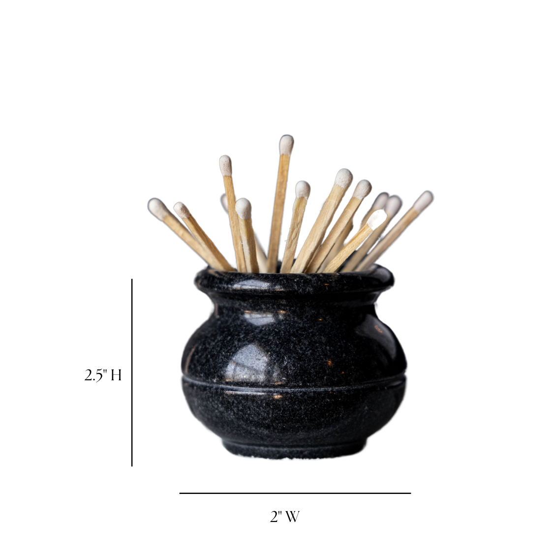 Dimensions: 2.5 inches tall x 2 inches wide approximately The Black Marble Match Holder offers a luxurious, high-quality solution for displaying your matches on any surface, such as coffee tables, shelves, and side tables. A stylish and easy addition to your home decor, the Black Marble Match Holder adds a touch of elegance to any space. Each handmade product is unique. Slight variations in pattern, color, and appearance are part of the handmade charm. Made in India